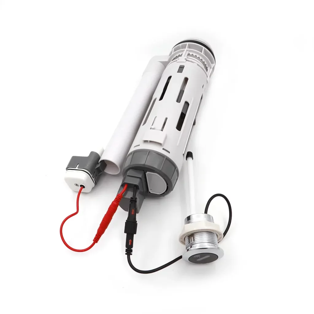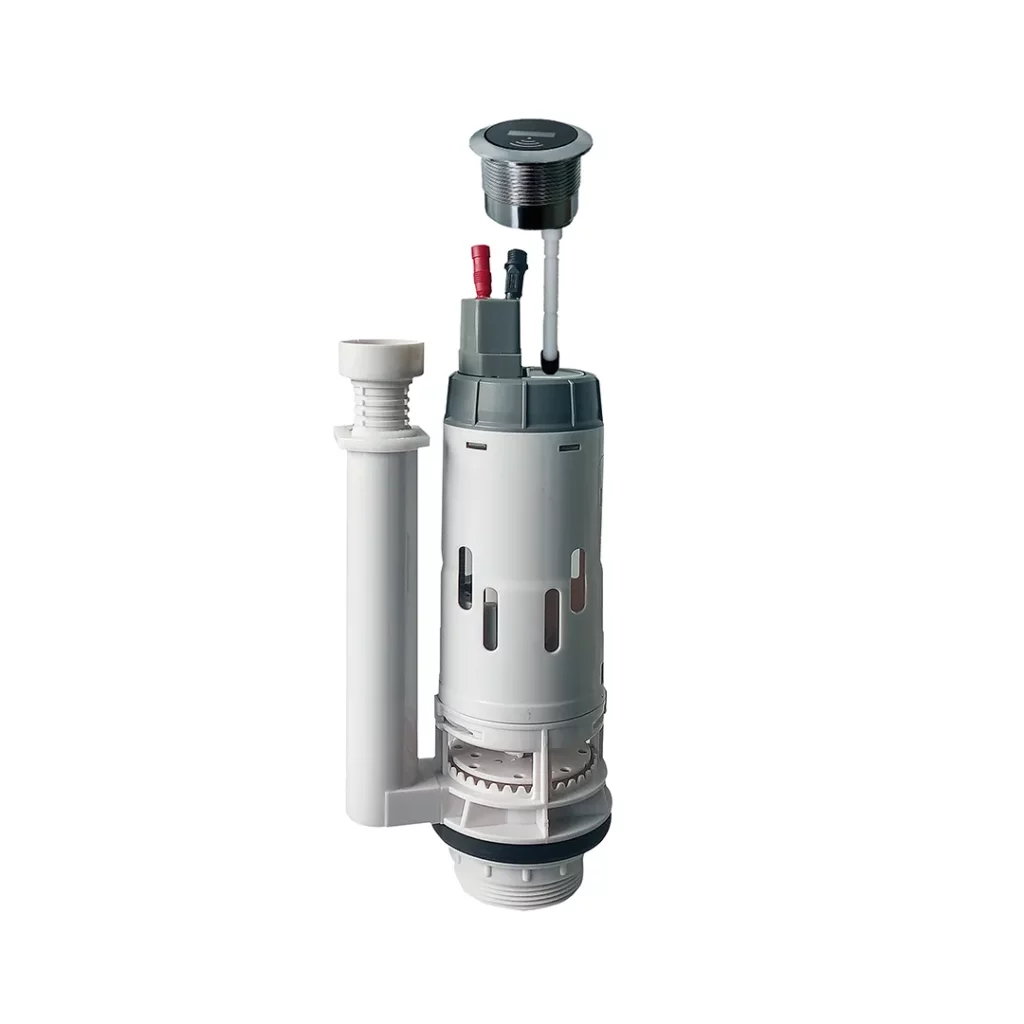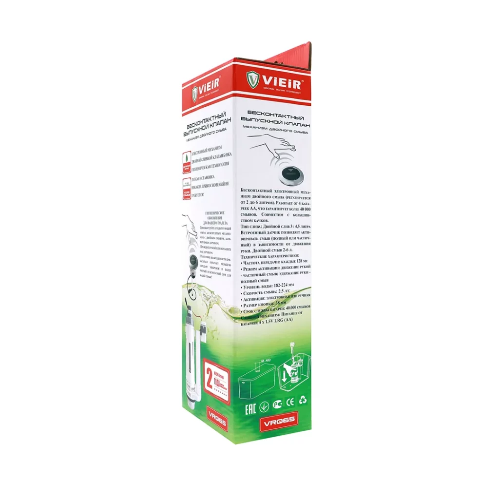 Универсальный механизм двойного смыва предназначен для переоборудования механического сливного механизма бачка унитаза с кнопкой в бесконтактный автоматический слив. Механизм работает от четырех батареек АА и не требует подключения к источнику питания, заряда хватит более чем на 40 000 смывов. Двухрежимный смыв позволяет регулировать объем воды — от 2 до 6 литров в зависимости от движения руки. При удержании руки над датчиком активируется полный смыв, при движении руки — частичный смыв, в случае если заряда энергии батареек не хватает для автоматической работы слива — нажмите кнопку промывки как в обычном механизме слива.