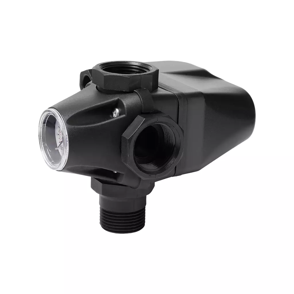 Блок контроля давления VER 9.1 со встроенным манометром применяется для управления любыми электрическими насосами мощностью до 1,0 кВт. VER9.1 – механический прибор пружинного типа действия, при падении давления в системе водоснабжения ниже настроечного значения контакты электроцепи замыкаются и включают насос, после достижения настроечного давления контакты размыкаются. Максимальная температура эксплуатации прибора от +1°С до +55°С. Заводские настройки включения/отключения — 1.3 / 2.6 Бар, при необходимости можно перенастроить в диапазоне от 1.0 до 5,3 Бар. Шкала манометра имеет циферблат с делением от 0 Бар до 6 Бар.