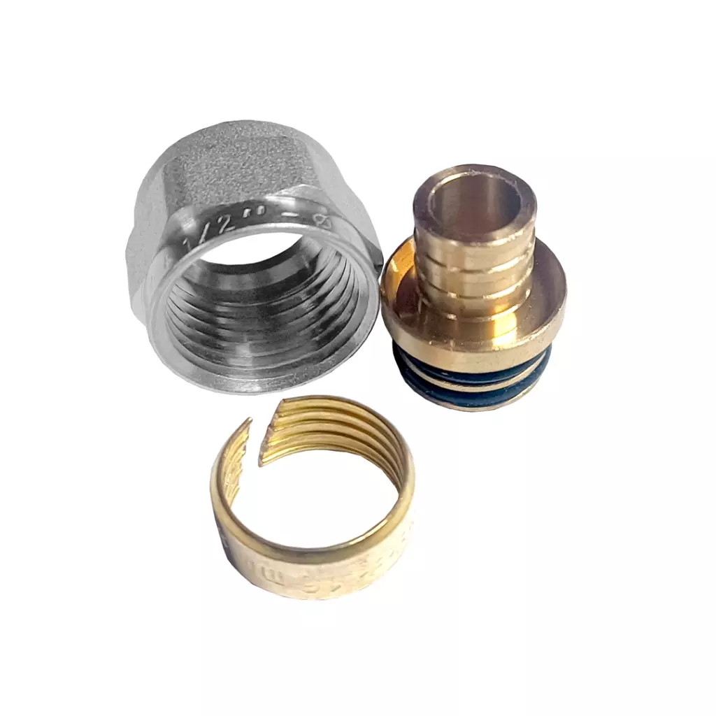 радиатора. Состоит из евроконусного штуцера с уплотнениями (антигальваническая изоляция), накидной гайки 3/4″ и разрезного кольца.
