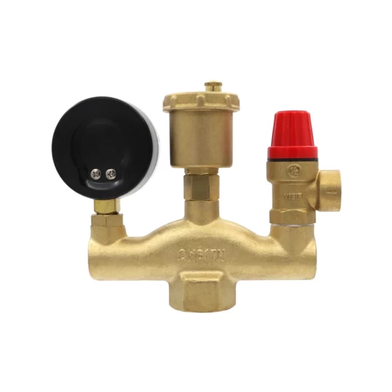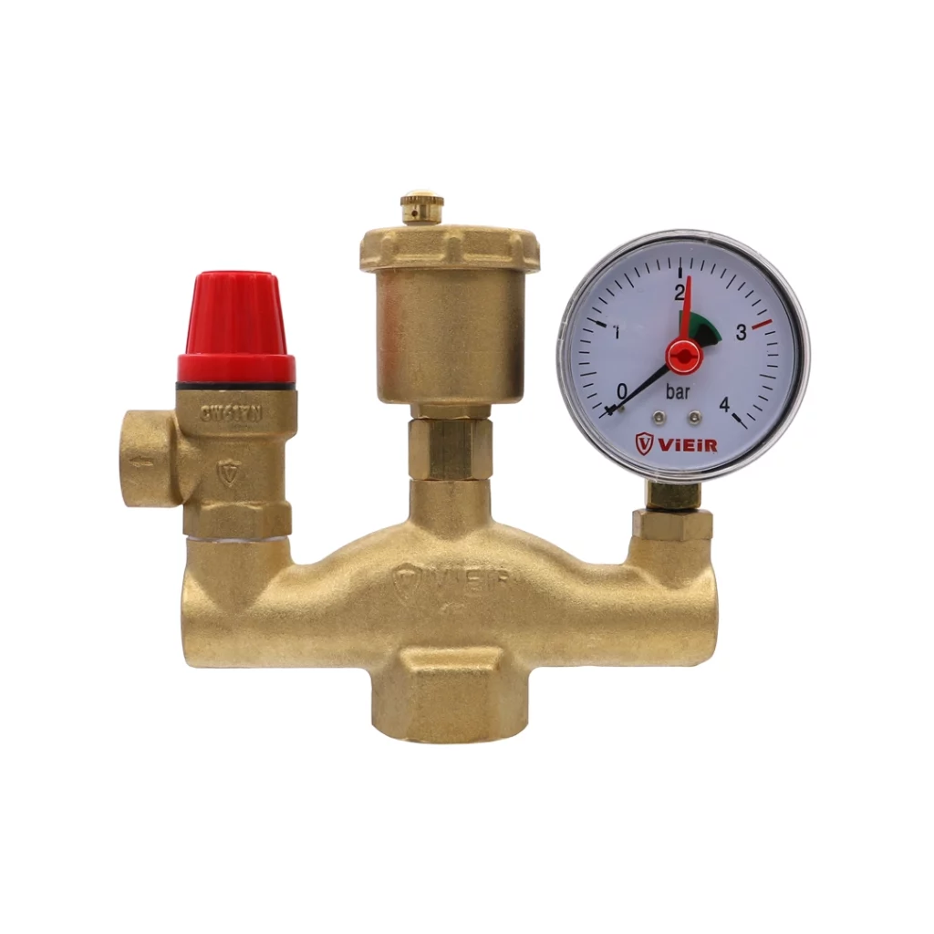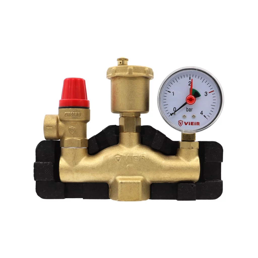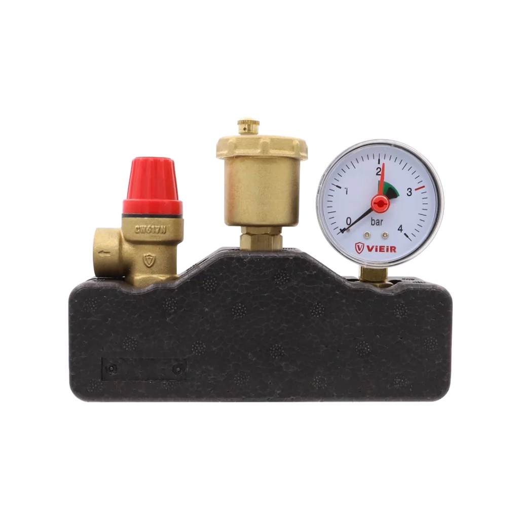 Группа безопасности обеспечивает выполнение следующих функций: защита от превышения давления в системе; отвод из системы воздуха и газов; индикация давления в системе на уровне манометра. Группа безопасности комплектуется автоматическим поплавковым воздухоотводчиком, предохранительным клапаном и манометром.