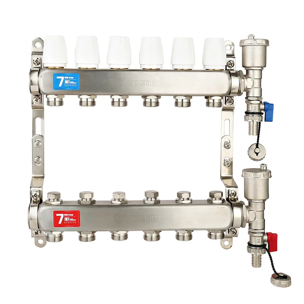 Коллектор из нержавеющей стали в сборе без расходомеров VIEIR от 2 до 12 выходов предназначен для распределения теплоносителя по системе радиаторного отопления в многоквартирных домах или зданиях индивидуальной постройки. Изделие способно направлять теплоноситель на несколько зон отопления.