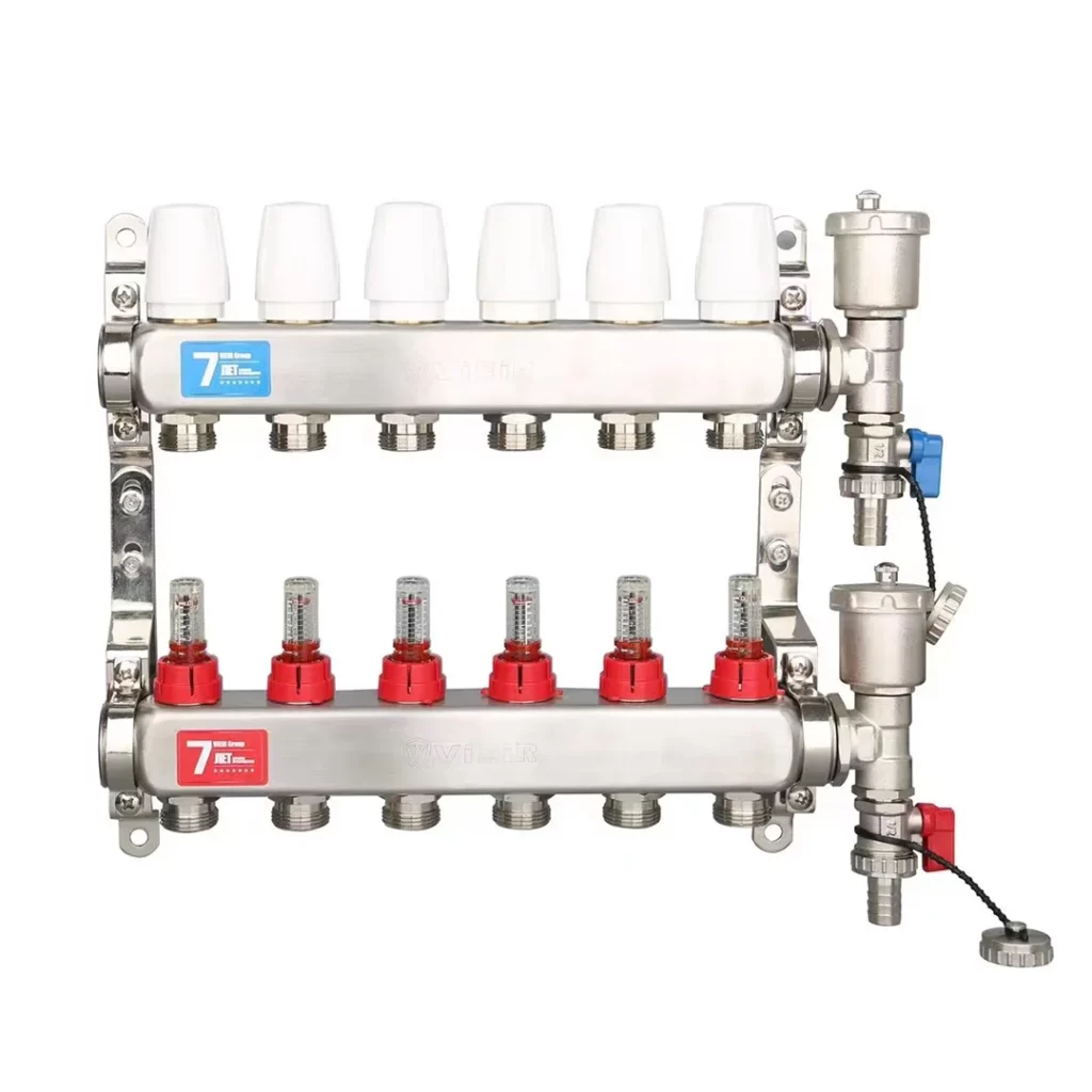 Коллектор из нержавеющей стали в сборе с расходомерами VIEIR от 2 до 12 выходов предназначен для распределения теплоносителя по системе радиаторного отопления в многоквартирных домах или зданиях индивидуальной постройки. Изделие способно направлять теплоноситель на несколько зон отопления.