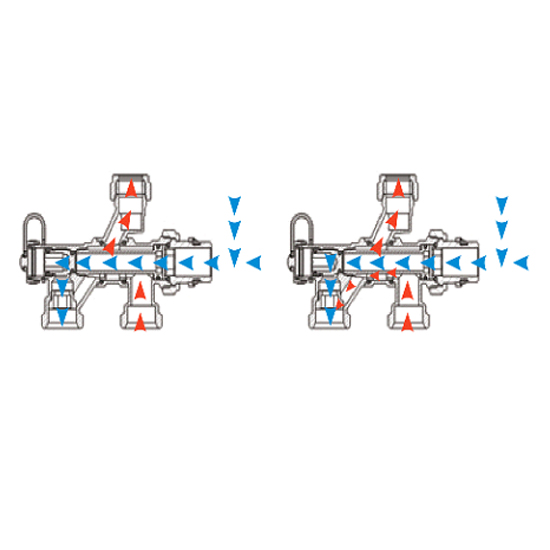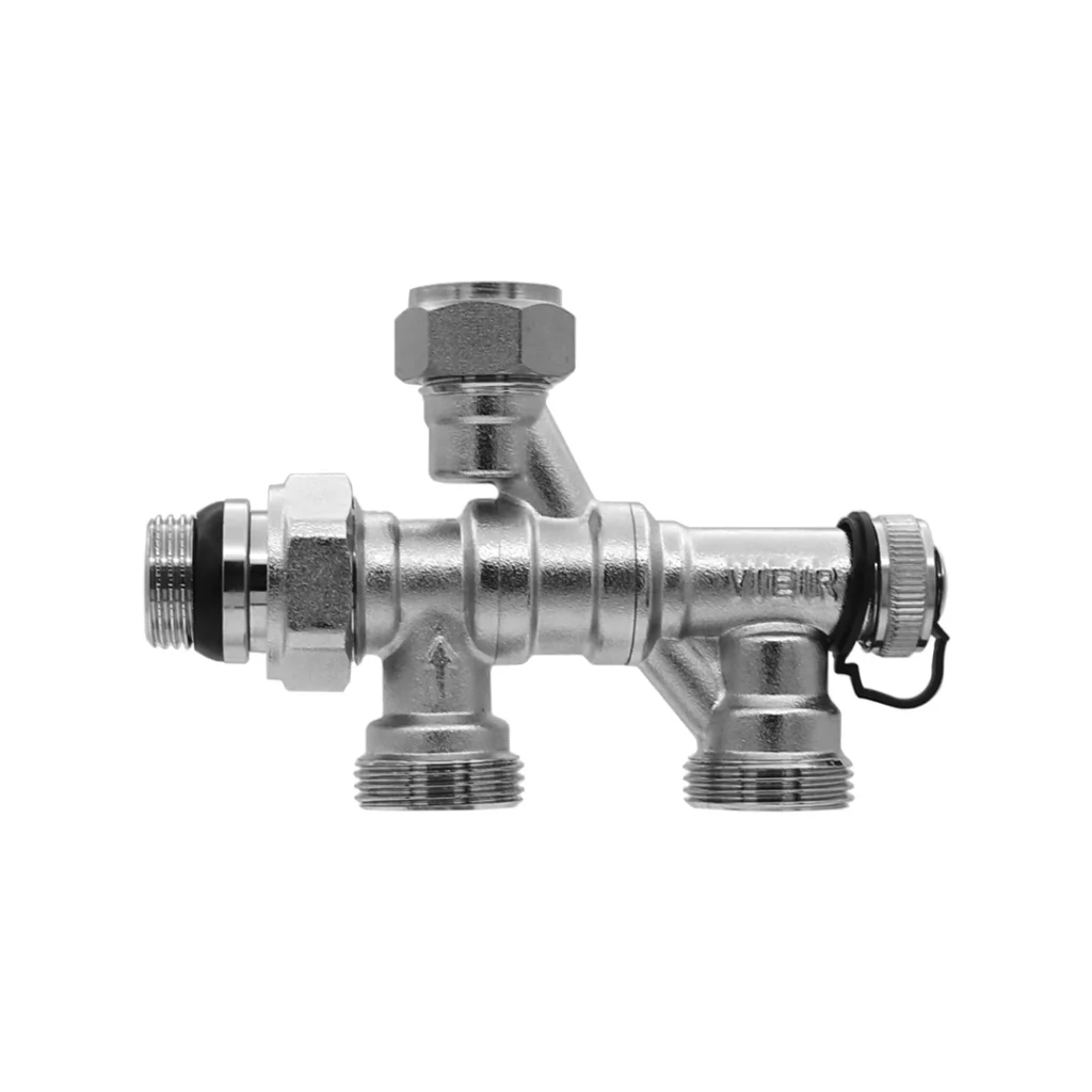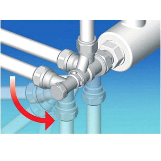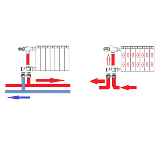 Использование данного комплекта подходит одновременно для двухтрубной системы отопления и однотрубной. Изначально узел собирают на заводе под двухтрубную систему отопления, для его трансформации в однотрубную требуется выкрутить заглушку разделителя потока — узла байпаса.