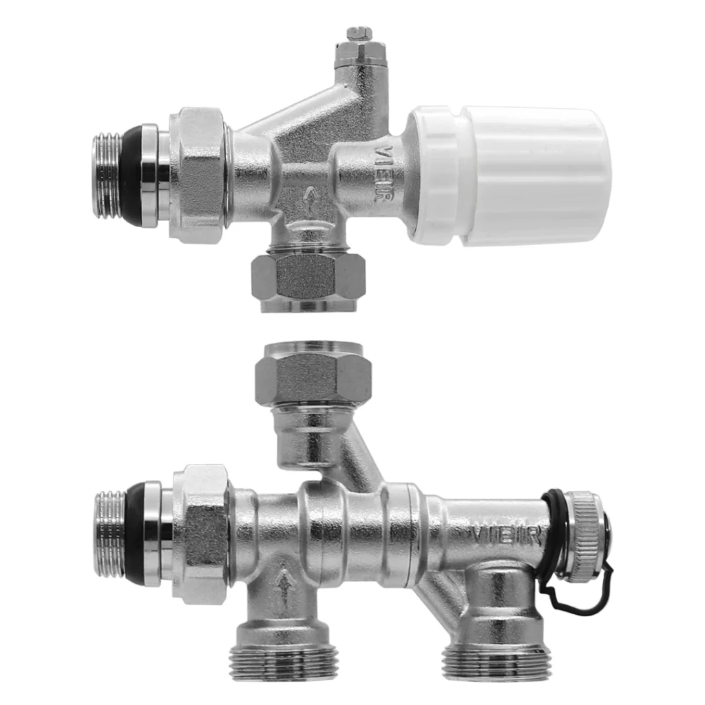 Термостатический комплект применяется для нижнего бокового подключения отопительных приборов систем водяного отопления при расположении подводящих трубопроводов снизу радиатора (в полу, в плинтусе, над плинтусом). Узел оснащен вращающимися на 360˚ соединениями для подключения к подводящим трубам как из пола, так и из стены.