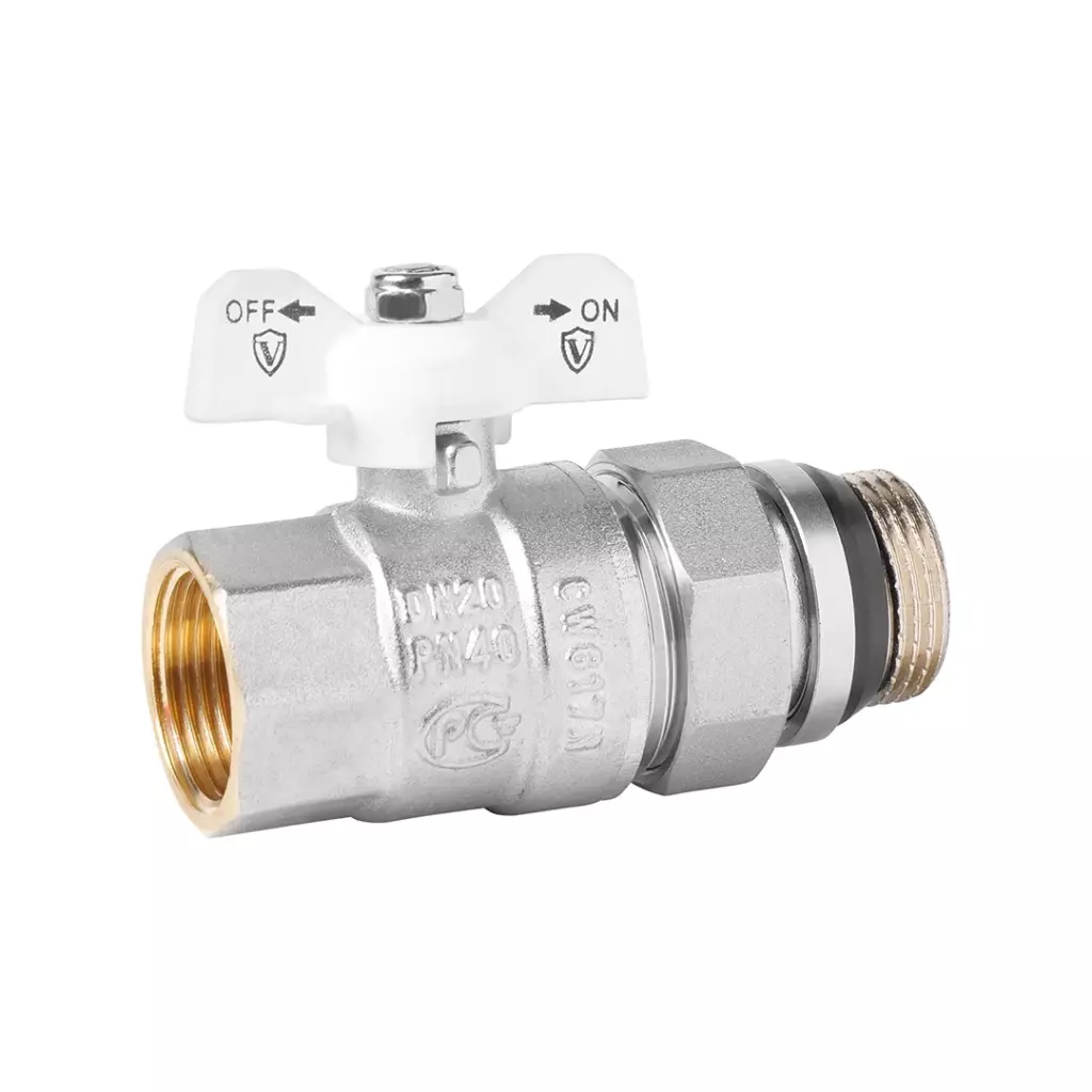 Кран оснащен ручкой типа «бабочка» с утолщенной стенкой из алюминиевого сплава и эпоксидной покраской белого цвета. Резьба присоединений – внутренняя/наружная. Полусгон укомплектован уплотнительным кольцом из эластомера EPDM. Шаровые краны VIEIR – полнопроходные, ремонтопригодные, краны этой серии отличаются усиленным, массивным корпусом с увеличенной длиной присоединительной резьбы, что обеспечило их повышенную прочность и надежность. Увеличенная ресурсная надежность достигается за счет алмазной полировки затворного шара и последующего его хромирования (исключается прилипание инородных примесей на поверхность рабочей зоны и преждевременное изнашивание седельных уплотнительных колец), использования термостойкого тефлона со специальными эластомерными добавками, полированного и никелированного латунного штока. Отсутствует вероятность разрушения герметичности штока давлением транспортируемой жидкости, т. к. шток вставлен во внутрь корпуса. Ремонтопригодность крана обеспечивается за счет использования сменного тефлонового сальника с прижимной гайкой.