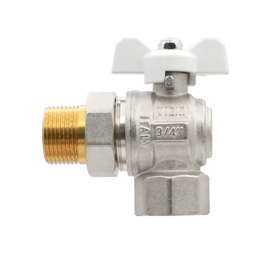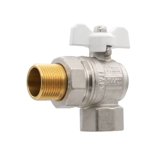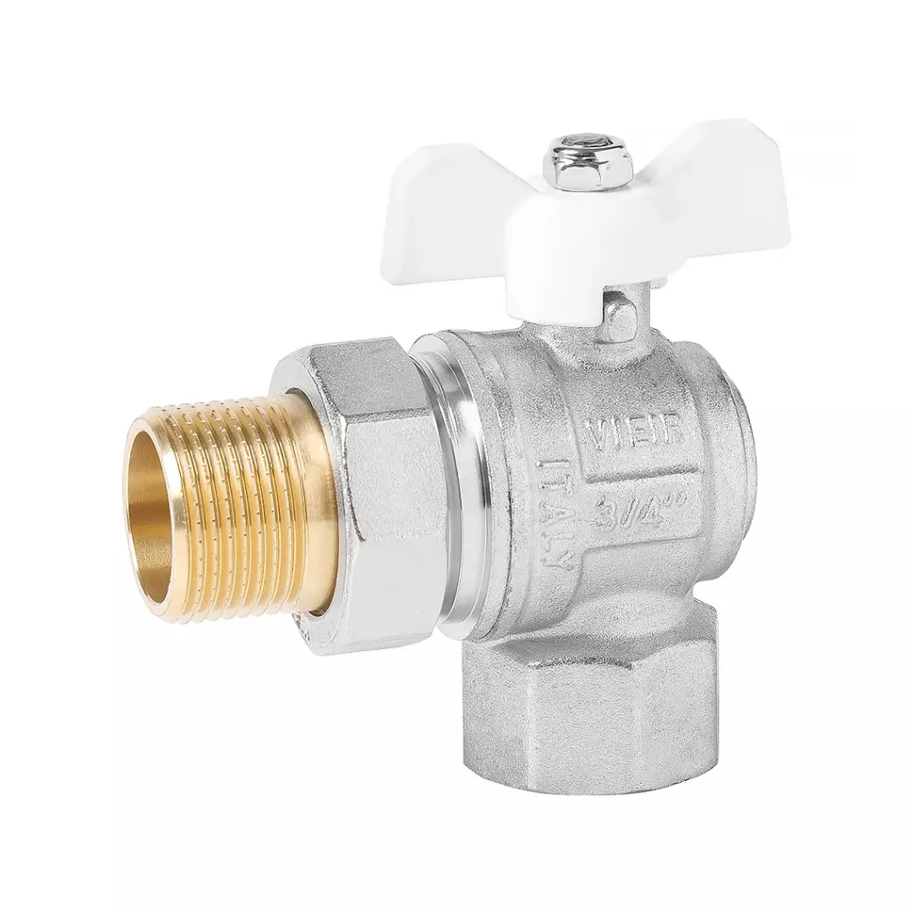Угловой полнопроходной ремонтопригодный шаровой кран с увеличенным ресурсом. Соединен накидной гайкой с резьбовым полусгоном. Кран оснащен ручкой типа «бабочка» с утолщенной стенкой из алюминиевого сплава и эпоксидной покраской белого цвета. Резьба присоединений – внутренняя/наружная. Соединен накидной гайкой с резьбовым полусгоном. Шаровые краны этой серии отличаются усиленным, массивным корпусом с увеличенной длиной присоединительной резьбы, что обеспечило их повышенную прочность и надежность. Увеличенная ресурсная надежность достигается за счет алмазной полировки затворного шара и последующего его хромирования (исключается прилипание инородных примесей на поверхность рабочей зоны и преждевременное изнашивание седельных уплотнительных колец), использования термостойкого тефлона со специальными эластомерными добавками, полированного и никелированного латунного штока. Отсутствует вероятность разрушения герметичности штока давлением транспортируемой жидкости, т. к. шток вставлен во внутрь корпуса. Ремонтопригодность крана обеспечивается за счет использования сменного тефлонового сальника с прижимной гайкой.