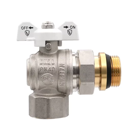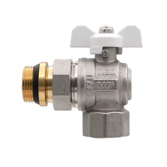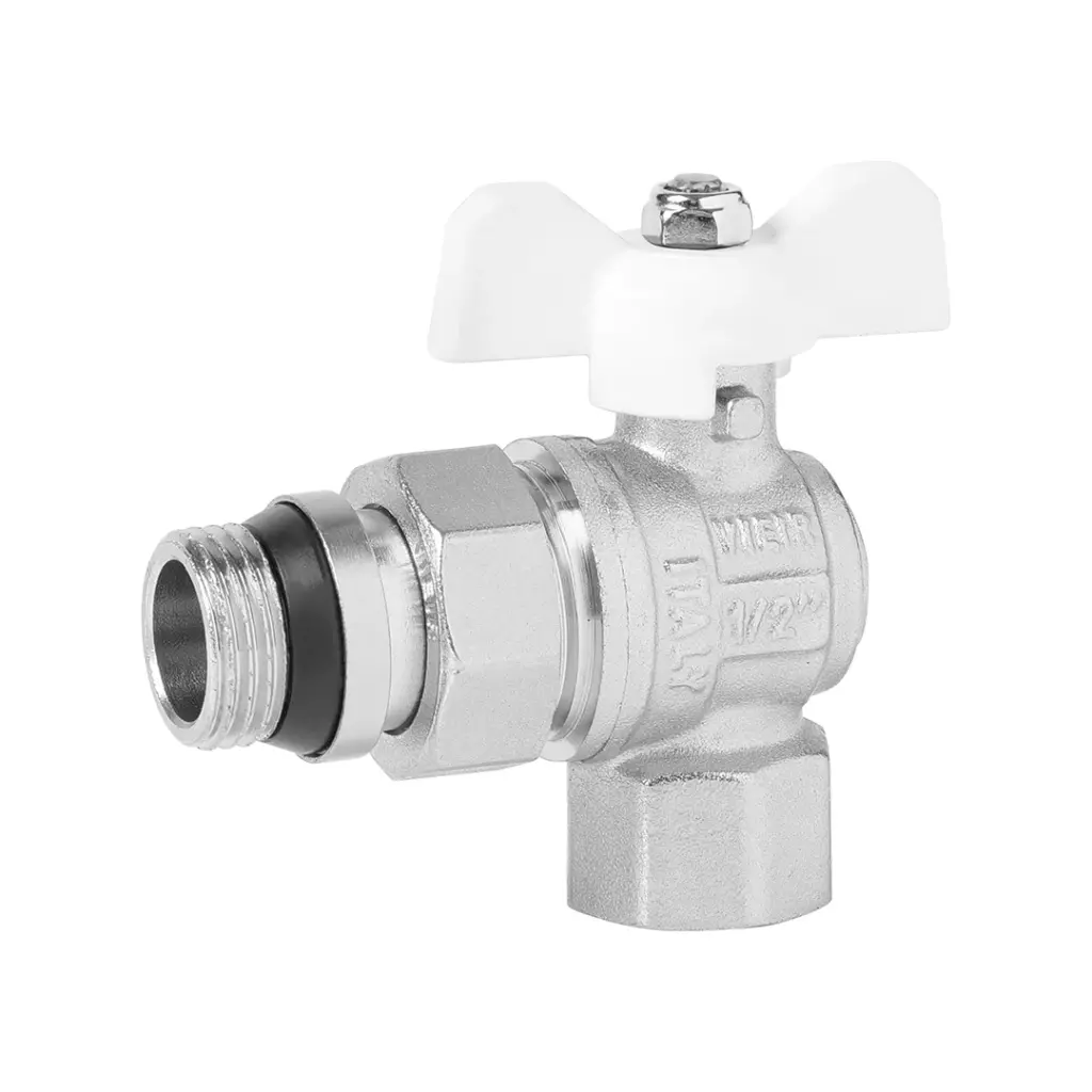 Угловой полнопроходной ремонтопригодный шаровой кран с увеличенным ресурсом. Соединен накидной гайкой с резьбовым полусгоном. Полусгон укомплектован уплотнительным кольцом из эластомера EPDM. Кран оснащен ручкой типа «бабочка» с утолщенной стенкой из алюминиевого сплава и эпоксидной покраской белого цвета. Резьба присоединений – внутренняя/наружная. Соединен накидной гайкой с резьбовым полусгоном. Шаровые краны этой серии отличаются усиленным, массивным корпусом с увеличенной длиной присоединительной резьбы, что обеспечило их повышенную прочность и надежность. Увеличенная ресурсная надежность достигается за счет алмазной полировки затворного шара и последующего его хромирования (исключается прилипание инородных примесей на поверхность рабочей зоны и преждевременное изнашивание седельных уплотнительных колец), использования термостойкого тефлона со специальными эластомерными добавками, полированного и никелированного латунного штока. Отсутствует вероятность разрушения герметичности штока давлением транспортируемой жидкости, т. к. шток вставлен во внутрь корпуса. Ремонтопригодность крана обеспечивается за счет использования сменного тефлонового сальника с прижимной гайкой.