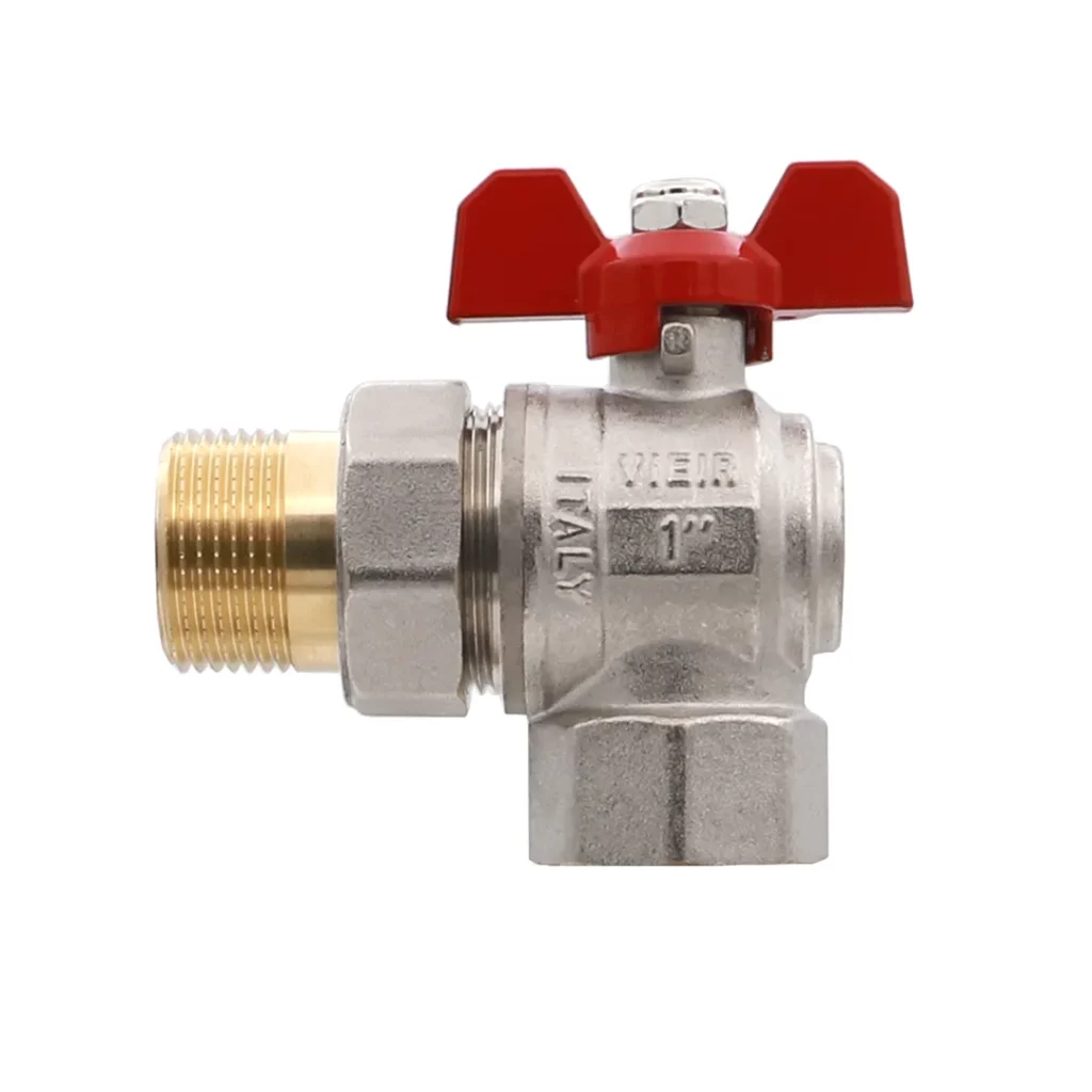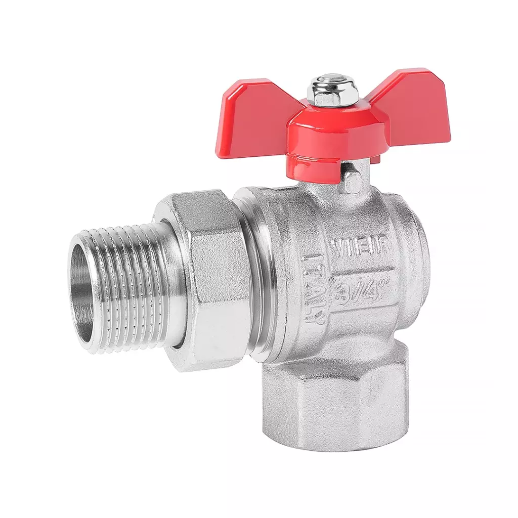 Угловой полнопроходной ремонтопригодный шаровой кран с увеличенным ресурсом. Соединен накидной гайкой с резьбовым полусгоном. Кран оснащен ручкой типа «бабочка» с утолщенной стенкой из алюминиевого сплава и эпоксидной покраской красного цвета. Резьба присоединений – внутренняя/наружная. Соединен накидной гайкой с резьбовым полусгоном. Шаровые краны этой серии отличаются усиленным, массивным корпусом с увеличенной длиной присоединительной резьбы, что обеспечило их повышенную прочность и надежность. Увеличенная ресурсная надежность достигается за счет алмазной полировки затворного шара и последующего его хромирования (исключается прилипание инородных примесей на поверхность рабочей зоны и преждевременное изнашивание седельных уплотнительных колец), использования термостойкого тефлона со специальными эластомерными добавками, полированного и никелированного латунного штока. Отсутствует вероятность разрушения герметичности штока давлением транспортируемой жидкости, т. к. шток вставлен во внутрь корпуса. Ремонтопригодность крана обеспечивается за счет использования сменного тефлонового сальника с прижимной гайкой.
