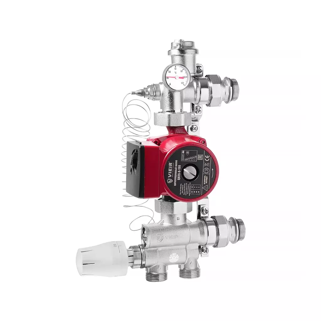 Насосно-смесительный узел предназначен для создания низко-температурных систем отопления (типа «теплый пол»). Монтируется на коллекторной группе низкотемпературного контура, подключается к высокотемпературному контуру системы отопления. Принцип работы данного узла заключается в возможности регулировки температуры вторичного водоснабжения с помощью встроенного термостата и достижения оптимальной температуры системы отопления «тёплый пол».